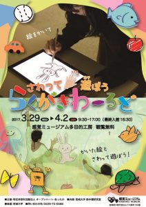 大崎市岩出山にある感覚ミュージアムにて,メディアアートイベント「さわって遊ぼう らくがきわーるど」を開催した.このイベントでは,ULABで実施しているお絵描き系研究で開発した技術を応用した,自分の描いた絵に触って遊ぶことができる体験型システムを新たに開発し,展示を行った.5日間の開催期間中に1,568名の来場者があり,子どもからお年寄りまで幅広い年代の方々がインタラクティブなお絵描き体験を楽しんでいた.