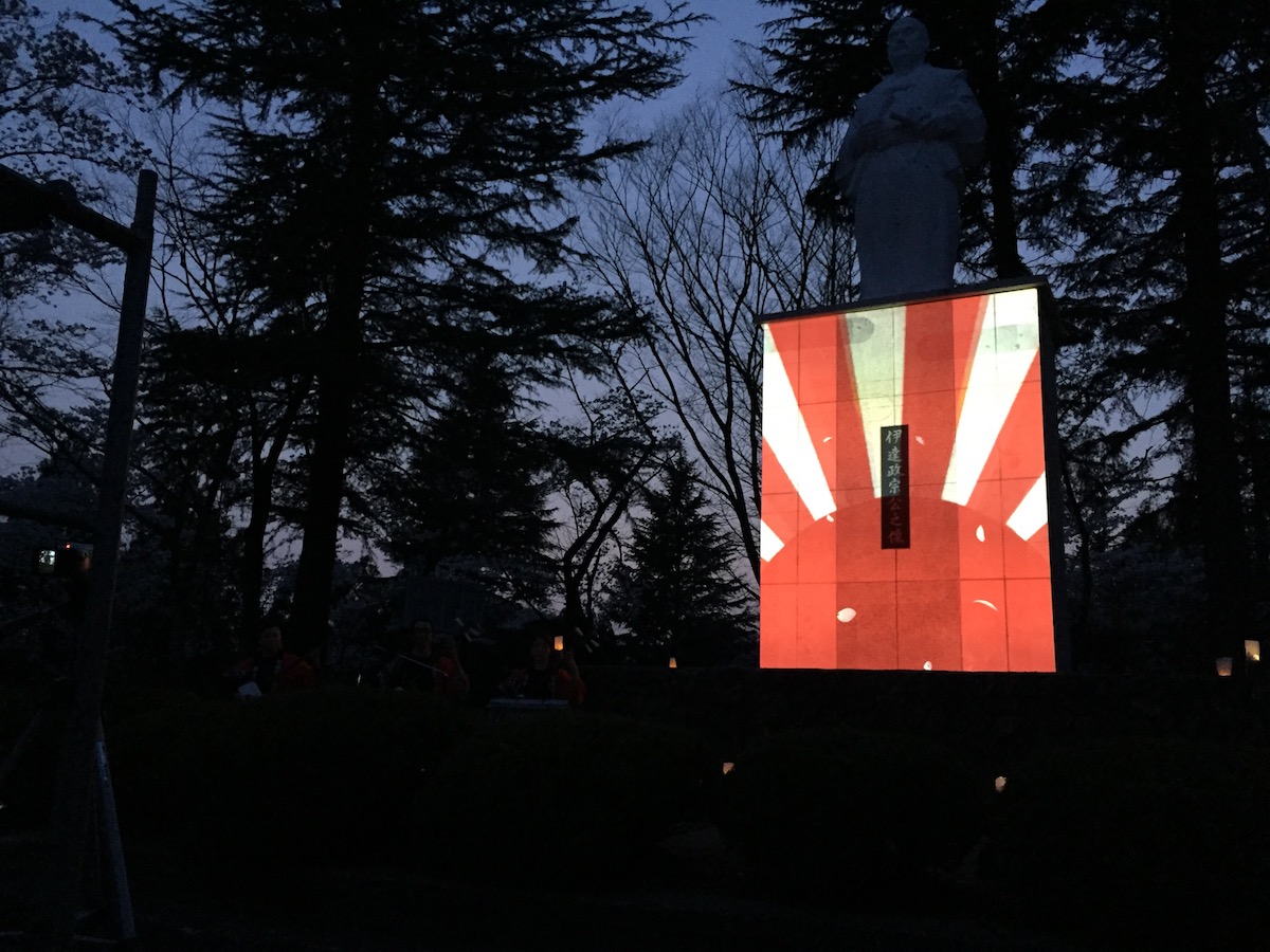 大崎市岩出山にある城山公園にて開催された「岩出山さくら祭り」にて,学生団体bitsと共にプロジェクションマッピングを実施した.かつて仙台駅から城山公園に移設された伊達政宗像の台座に対して,岩出山地区にまつわる映像やCGを投影し,祭りの夜を盛り上げた.ULABとbitsは,祭りを運営する臥牛プロジェクトと共に企画段階から携わることで,岩出山地区のことを深く知るきっかけとなった.