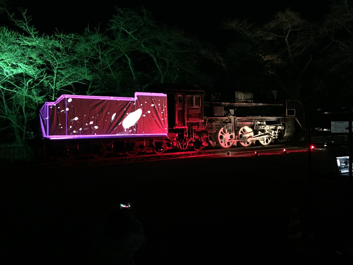 大崎市岩出山にある城山公園にて開催された「岩出山さくら祭り」にてプロジェクションマッピングを実施した.2016年に引き続き,学生団体bitsと共にさくら祭りのプロジェクトに参加し,メディアアート活動を行った.今回は,地元の方からの要望もあり,城山公園の中腹にあるSLを投影の対象とした.多くの人たちがSLの周囲やSLを望める山頂に続く通路から作品を鑑賞し,桜のライトアップの前に浮かび上がる幻想的な映像空間を堪能していた.