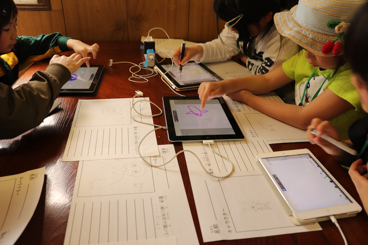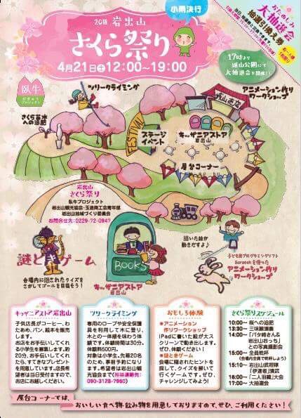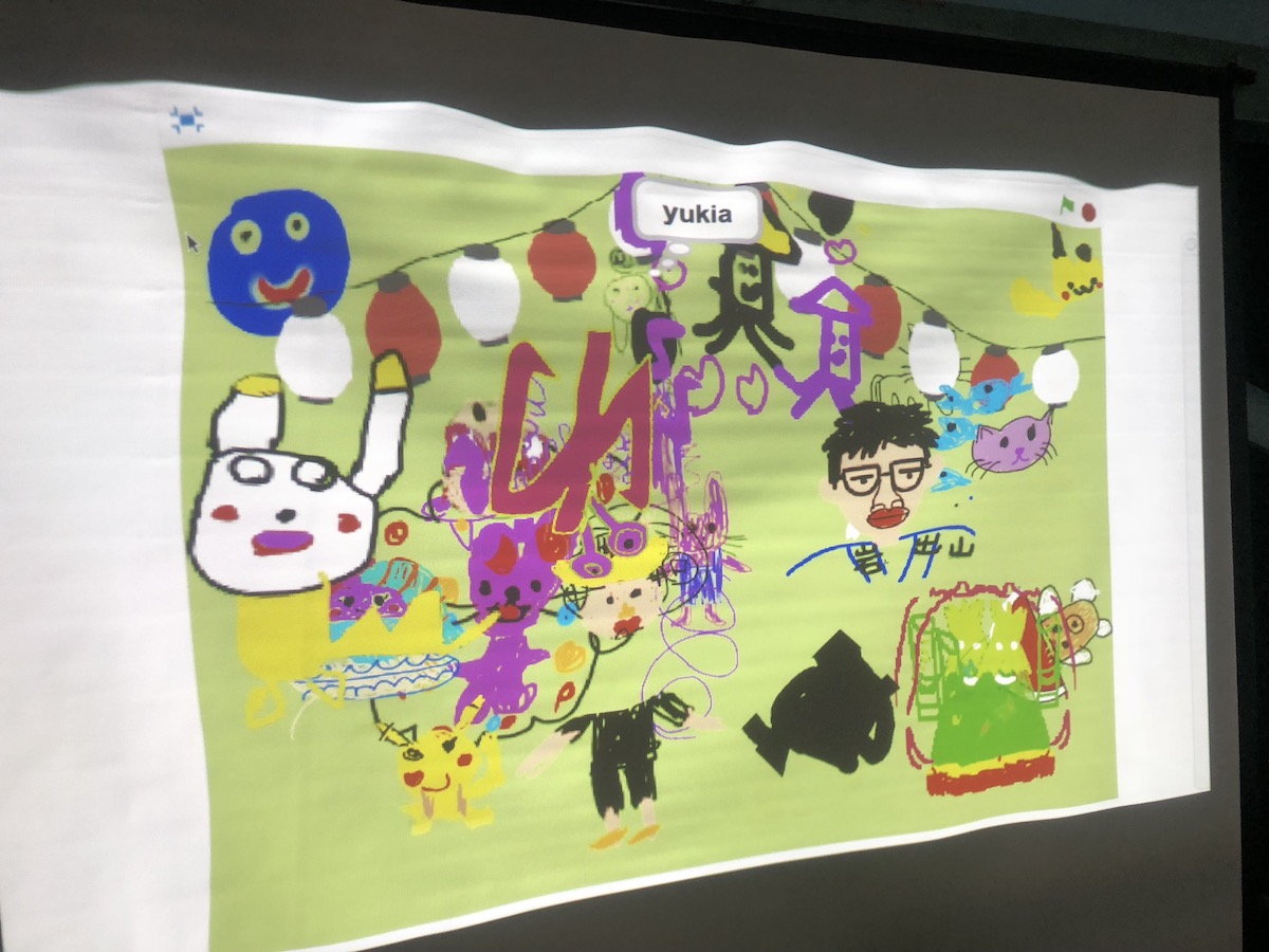 大崎市岩出山にある城山公園にて開催された「岩出山さくら祭り」にてアニメーション制作を実施した.今回も学生団体bitsと共にさくら祭りのプロジェクトに参加し,ワークショップ形式のイベントとして,子ども向けのアニメーション制作を行った.このワークショップは,参加者が自ら描いた下書きの絵をタブレット上で絵を描いてもらい,その絵をプログラミング学習用ソフトウェアの「Scratch」を用いてアニメーションを付けるという内容である.制作したアニメーションは会場に設置したスクリーンに常時表示させ,お祭りの賑やかな雰囲気を作り出した.