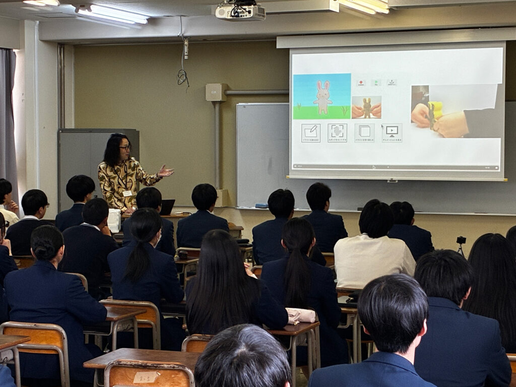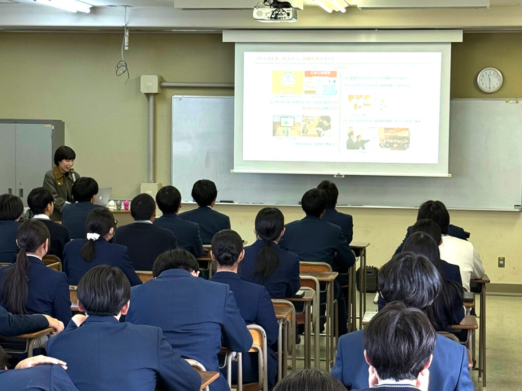 2026年3月23日(月)に岡山県立玉野光南高等学校にて出張講義を行いました.90分(45分×2コマ)の時間では,鈴木准教授はインタラクションデザインに関する基本的な考え方や,デジタルファブリケーションやフィジカルコンピューティングなどの関連技術について講義しました.高校からの要望により出張講義に同行した学部2年生の杉野さんは,大学に入学してから出会ったインタラクションデザインへの想いやこれまでの2年間での学びや制作した作品,学会発表などについて話を行いました.