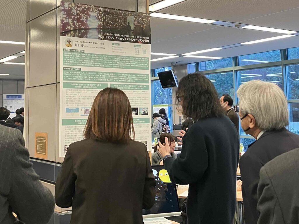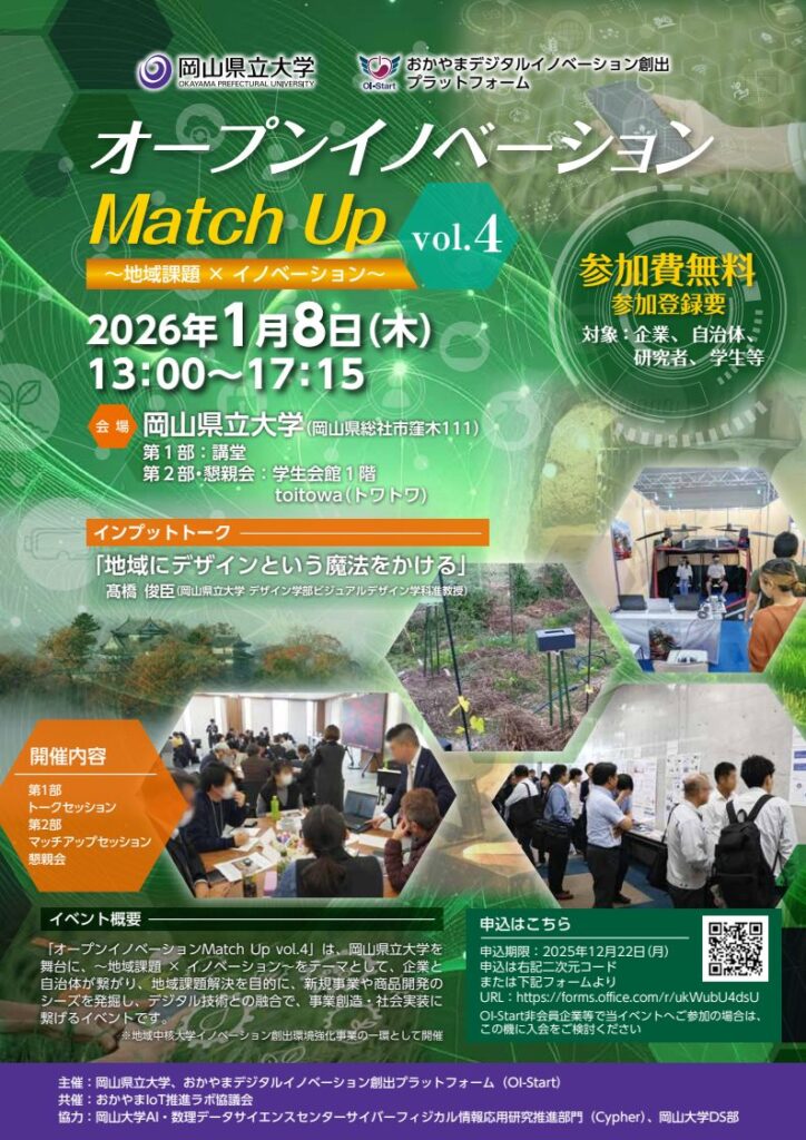 2026年1月8日に岡山県立大学で開催された,おかやまデジタルイノベーション創出プラットフォーム(OI-Start)が主催する「オープンイノベーション Match Up Vol. 4 ~地域課題×デザイン×デジタル~」にて,「プロモーション/ワークショップのデザインとコンテンツ開発」についてポスター発表を行いました.鈴木准教授は過去に企業や自治体等と協働で取り組んできたワークショップやプロモーション,コンテンツのデザインに関する事例を参加者に紹介し,それを基にした意見交換や情報交換を行いました.鈴木准教授がこのイベントに参加するのは今回で2回目となり,過去に情報交換をした企業と議論や交流を深めていました.
